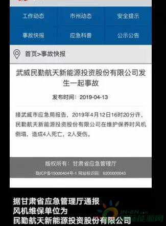 據(jù)武威市應(yīng)急局消息,2019年4月12日當(dāng)天16時20分許,甘肅民勤周家井航天新能源風(fēng)電場在進行風(fēng)機定檢工作,本次檢修隊伍人員由天津萬德萊斯科技有限公司(4人)、江蘇航天萬源風(fēng)電設(shè)備制造有限公司員工(1人)和甘肅航天萬源風(fēng)電設(shè)備制造有限公司員工(1人)組成,共計6人。風(fēng)機主設(shè)備供應(yīng)商(上述股權(quán)鏈中的一環(huán))組織開展檢修工作。在進行風(fēng)機定檢工作時,一臺風(fēng)機塔筒倒塌,風(fēng)機上6名檢修工作人員跌落,致4人死亡,1人重傷,1人輕傷。事故發(fā)生后,當(dāng)?shù)匾殉闪⒄{(diào)查組,全面調(diào)查事故原因,并對善后事宜進行處理。